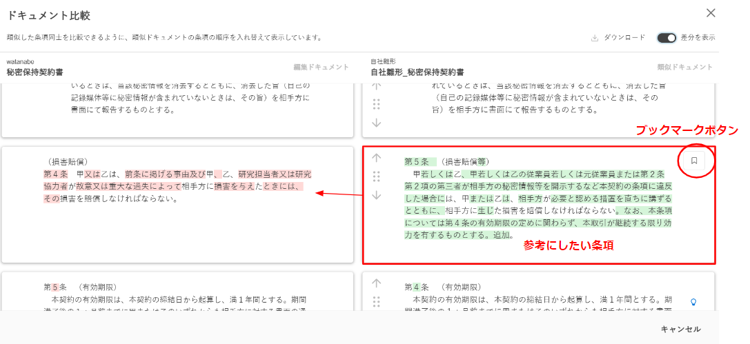 ドキュメントの比較画面で差分を見て、参考にしたい条文があれば条項ブロックの右上にあるブックマークのアイコンをクリックします。