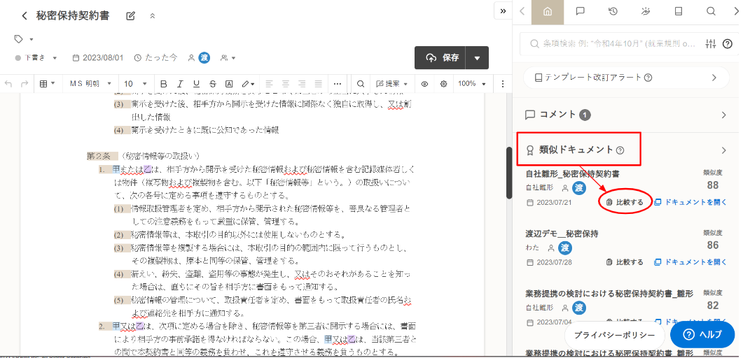 類似ドキュメントから比較したい文書を見つけ、比較するをクリックします。