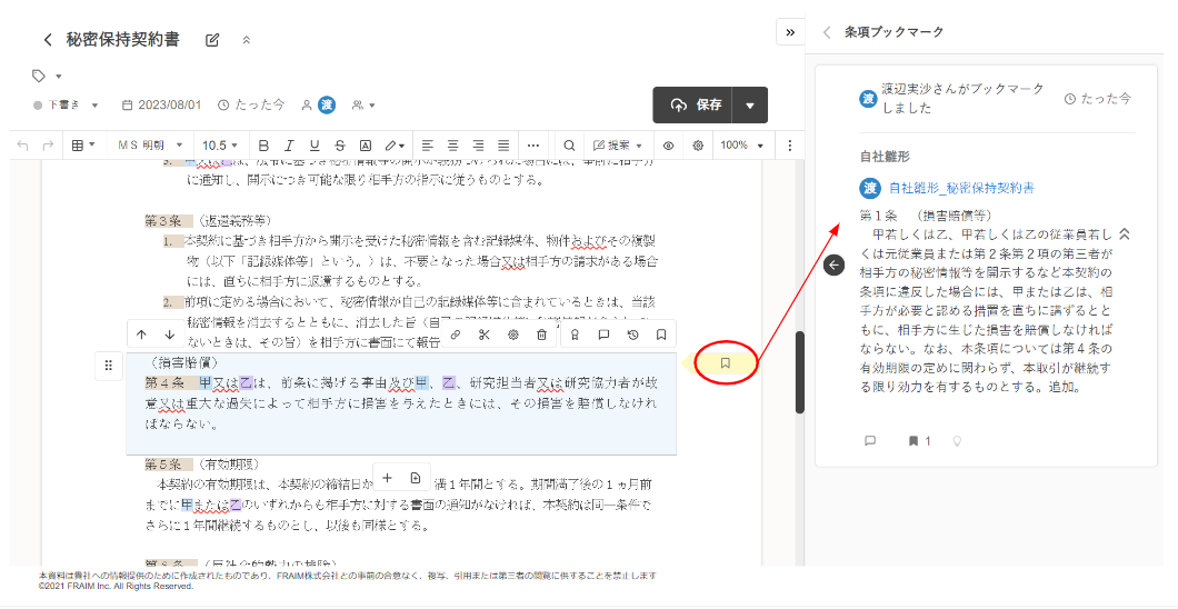 ブックマークアイコンをクリックすると、先ほどブックマークした条項が表示され、比較したままの状態でドキュメントを編集することが可能です。
