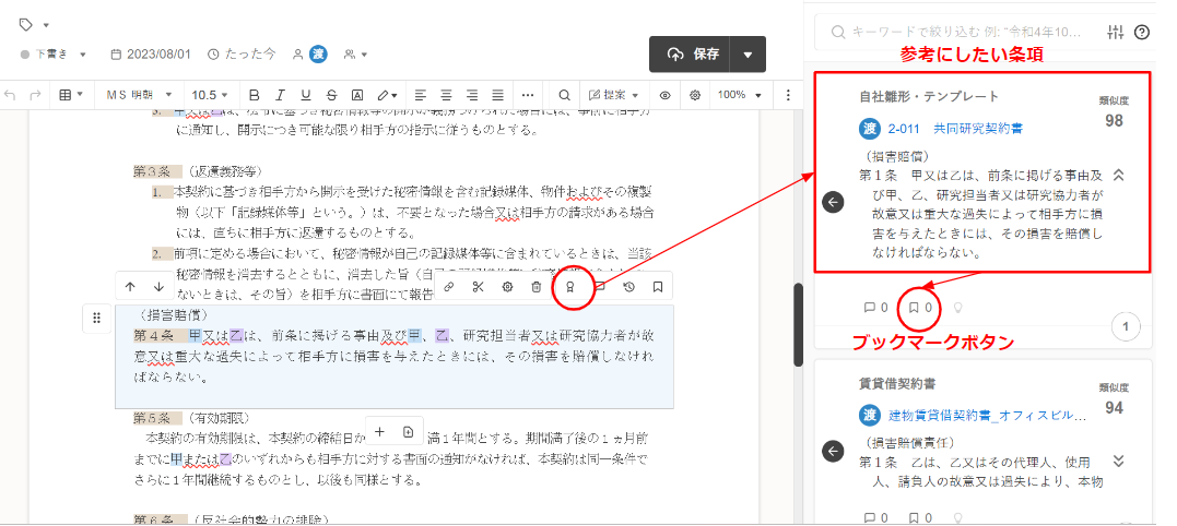 条項検索を行い(下図は類似条項検索ですが、キーワード検索や欠落サジェストも同様)、