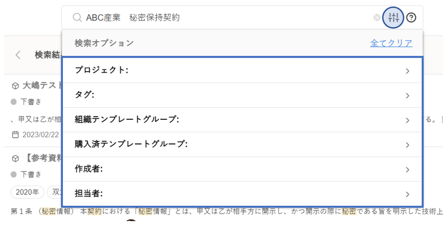 入力したキーワードを含む、かつ、特定のプロジェクト内に含まれるドキュメントといったような条件で検索することができます。