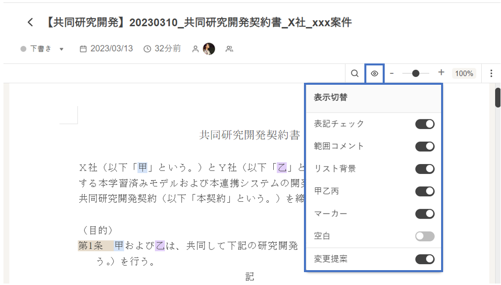「甲」「乙」やリスト番号(第●条etc)などに付いているハイライトを表示させるかどうか、手動でオン/オフを選択できます。