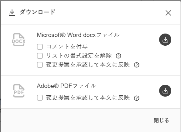 変更提案は、デフォルトではWordの変更履歴として出力されますが、[変更提案を承認して本文に反映]にチェックを入れると、Wordの変更履歴は表示されません。