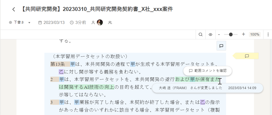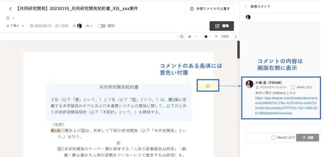 コメントがある条項には黄色い付箋が貼られ、付箋をクリックすると画面右側でコメントの内容を確認できます。
