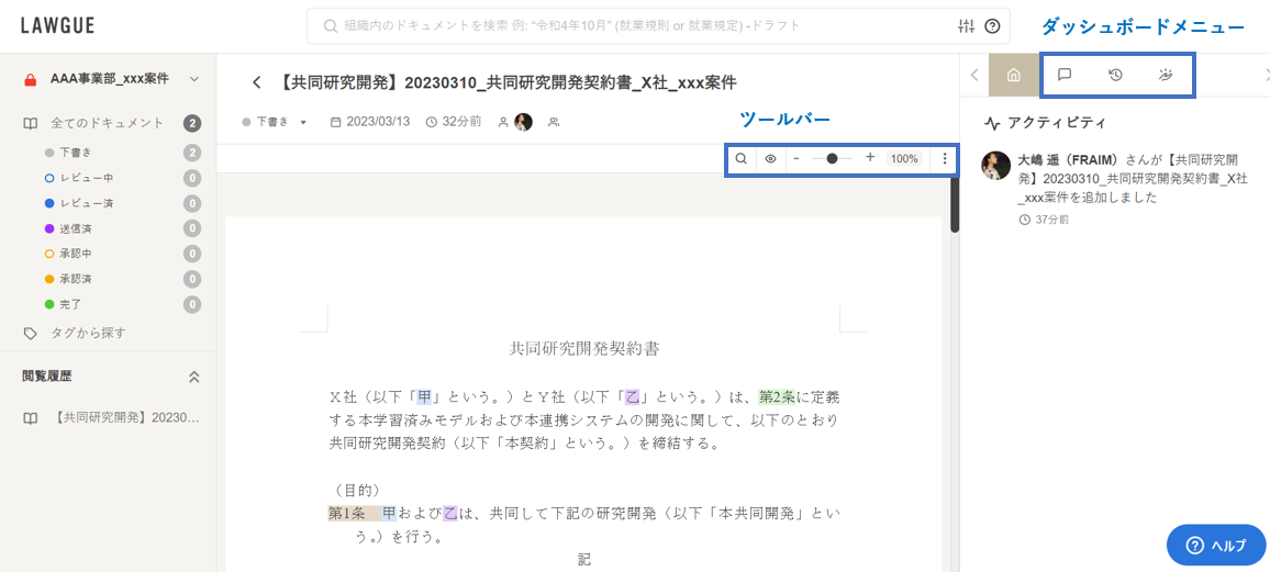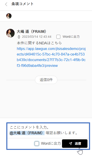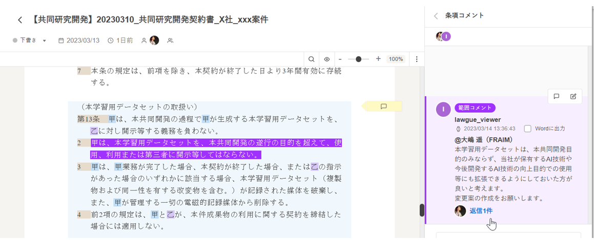 閲覧可能なドキュメントに付されているコメントがLAWGUE上で確認できる他、そのコメントに返信したり、新たなコメントを追加することもできます。