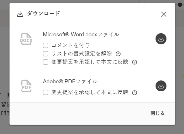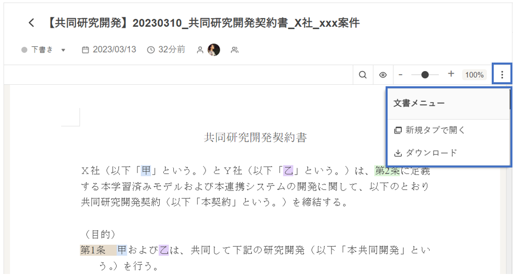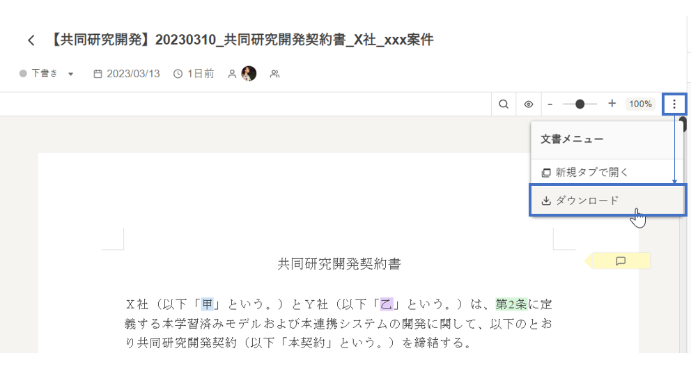 [︙]をクリックして文書メニューを開き、[ダウンロード]をクリックします。