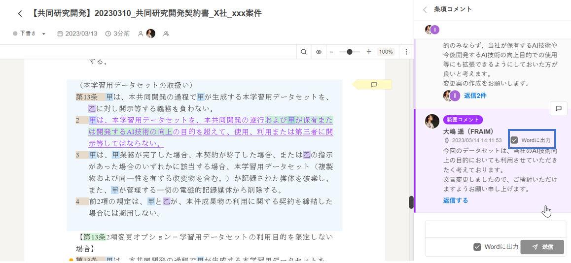 LAWGUE上で追加したコメントを出力した状態でWordファイルをダウンロードできます。