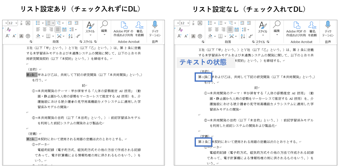 リスト設定は、デフォルトではダウンロードしたファイルでも引き継がれますが、[リストの書式設定を解除]にチェックを入れると、リストが外れテキストの状態でダウンロードされます。
