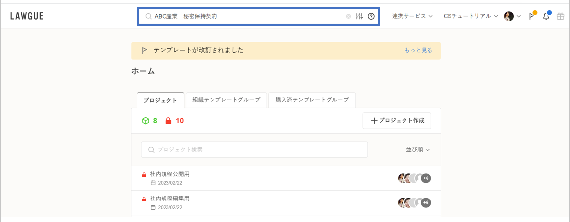 LAWGUEのホーム画面上部の検索窓からファイル検索ができます。