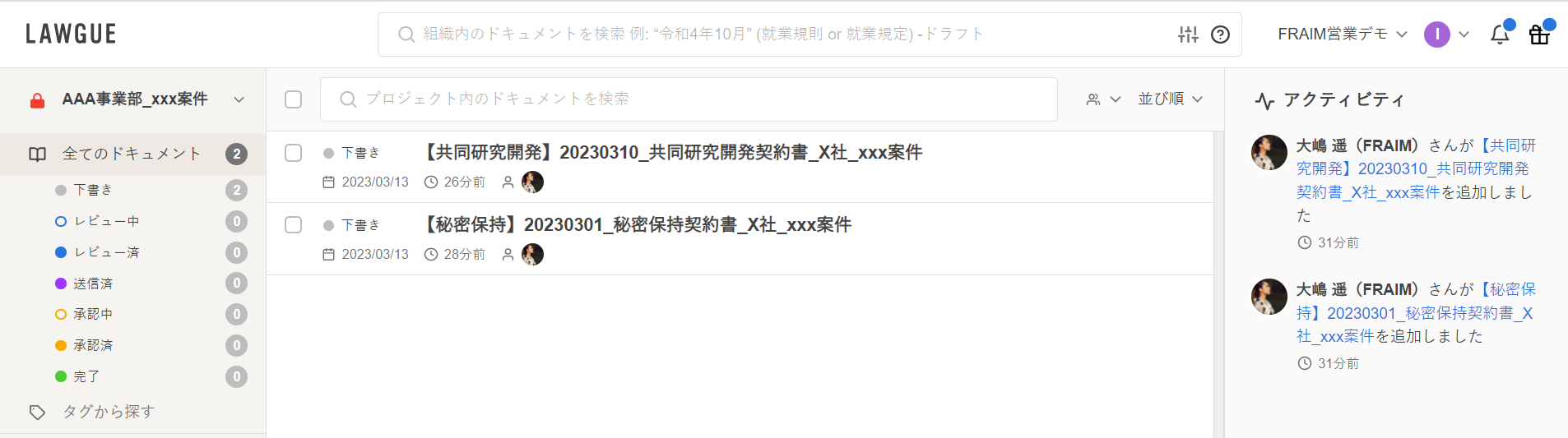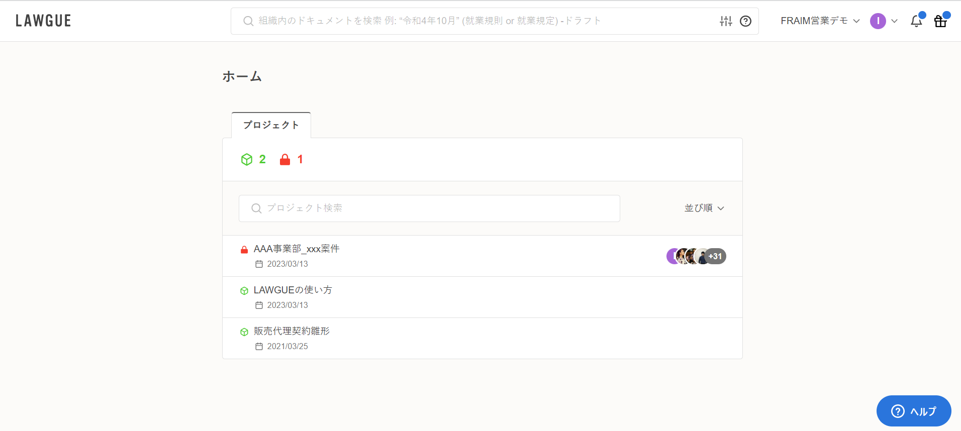 ホーム画面でプロジェクト名をクリックすると、当該プロジェクト内に格納されているドキュメントのタイトルが一覧表示されます。