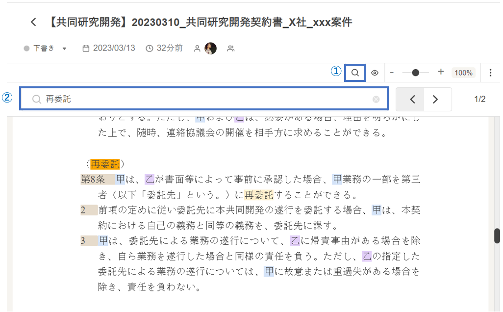 ②検索窓にキーワードを入力すると、ドキュメント内の当該キーワードがオレンジでハイライトされます。