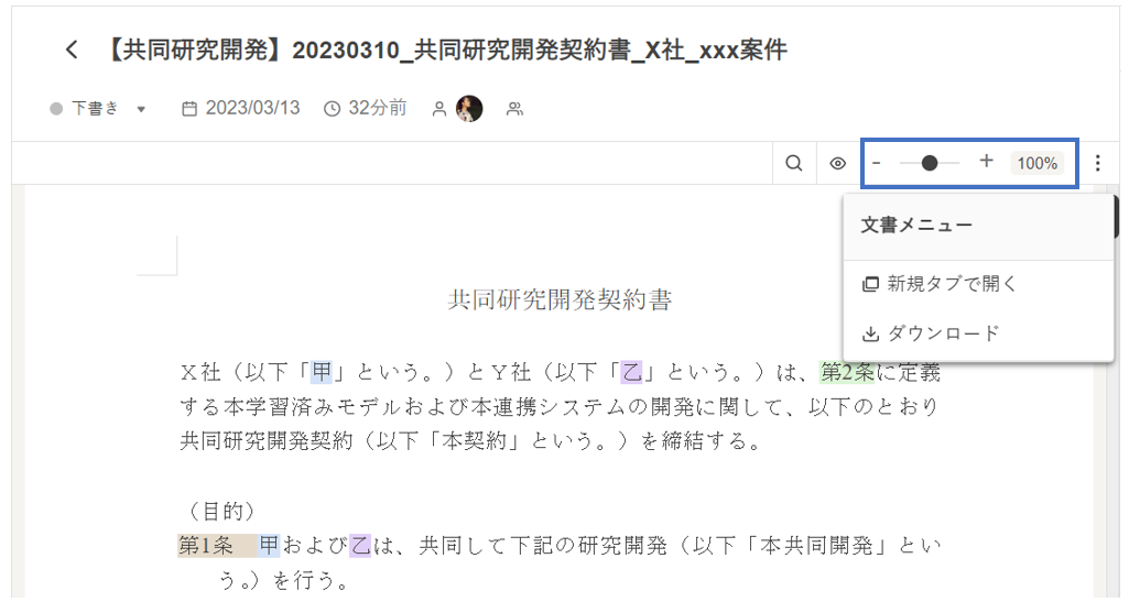 文書メニューでは、閲覧中のドキュメントをブラウザの別タブで開くことと、ドキュメントをダウンロードすることができます。