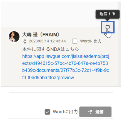 なお、[Wordに出力]のチェックボックスは、コメント入力欄にも表示されますので、コメント送信時点で出力有無を選択することができます。