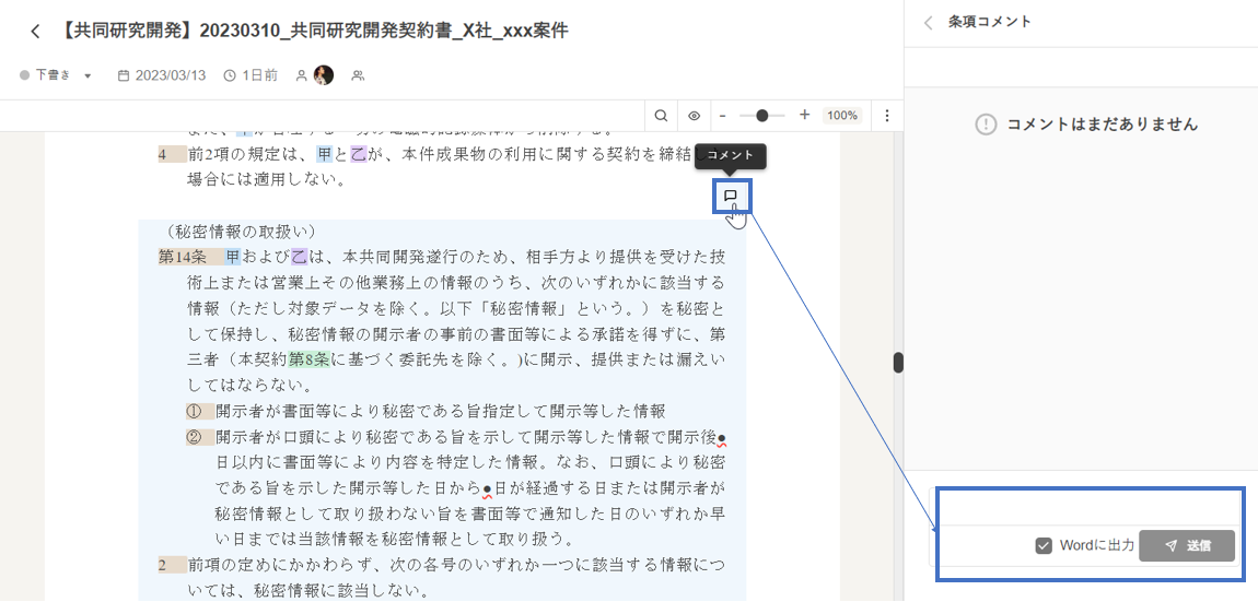 なお、範囲指定せず、条項全体にコメントすることも可能です。