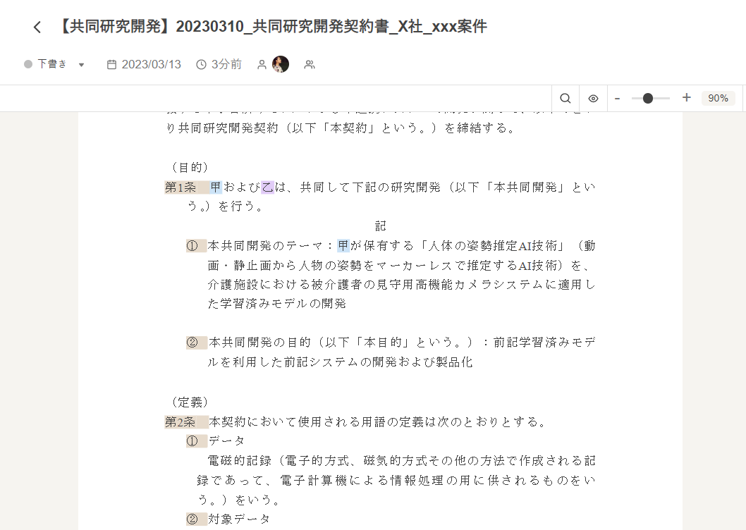 LAWGUEにファイルをアップロードすると、デフォルトで第1条や①などの番号が自動的にリスト化され、その部分にはグレーのハイライトがかかります。